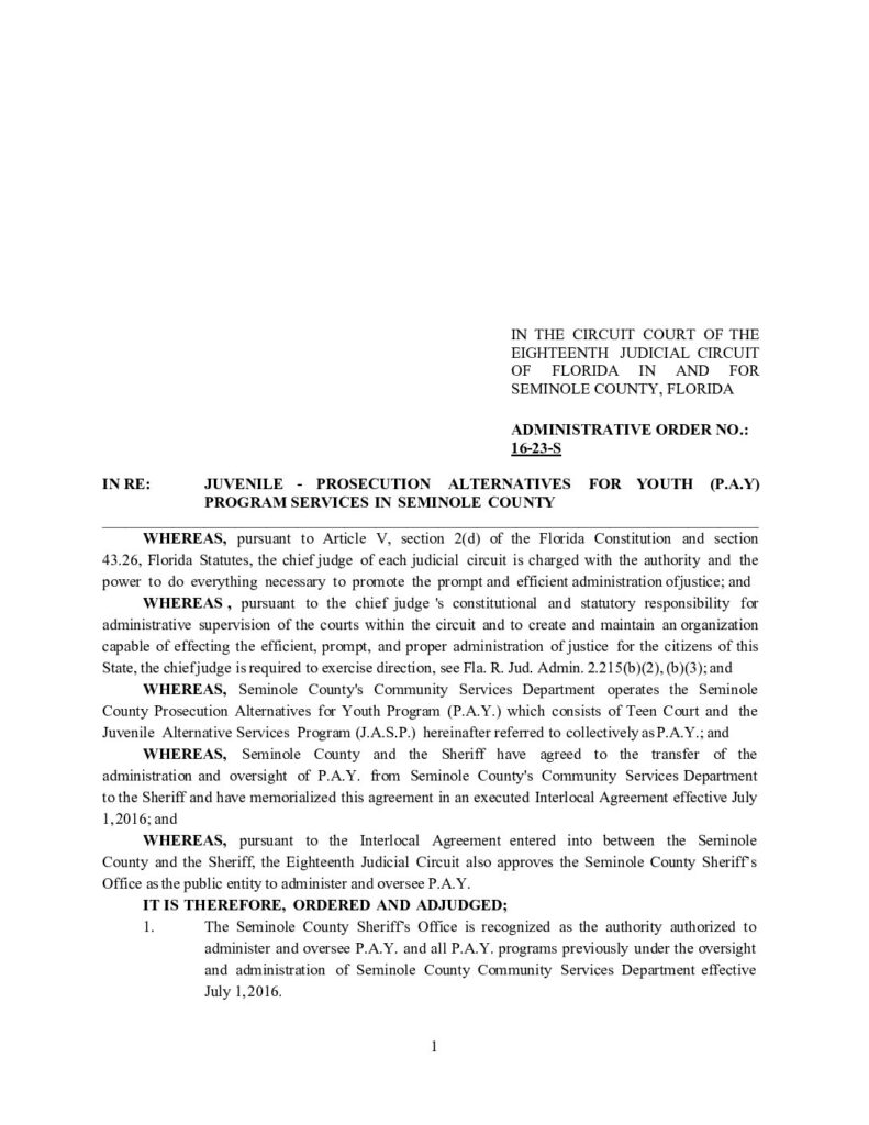 16-23-S IN RE: JUVENILE – PROSECUTION ALTERNATIVES FOR YOUTH (P.A.Y) PROGRAM SERVICES IN SEMINOLE COUNTY – ORDERED 6/27/2016 BY JOHN D. GALLUZZO
