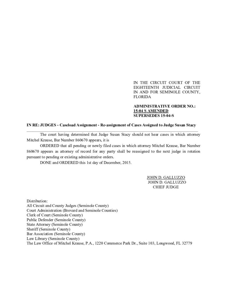 15-04 S, SUPERSEDES 15-04-S AMENDED IN RE: JUDGES – CASELOAD ASSIGNMENT, CASELOAD REASSIGNMENT OF CASES ASSIGNED TO JUDGE SUSAN STACY – ORDERED 12/01/2015 BY JOHN D. GALLUZZO