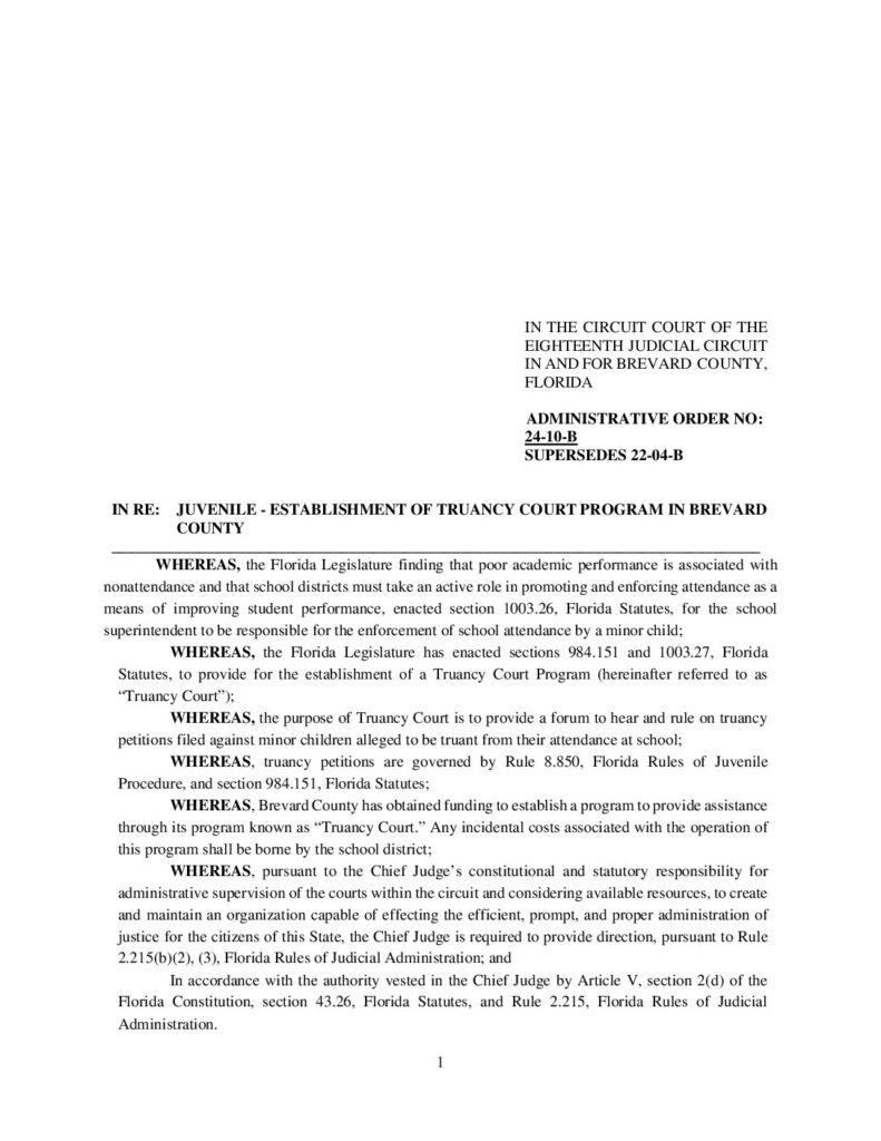 24-10-B, SUPERSEDES 22-04-B IN RE: JUVENILE – ESTABLISHMENT OF TRUANCY COURT PROGRAM IN BREVARD COUNTY – ORDERED 2/06/2024 BY CHARLES G. CRAWFORD