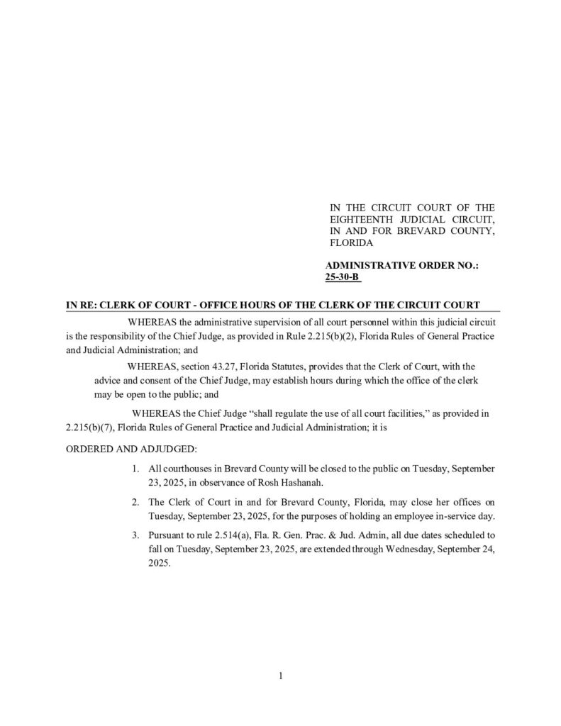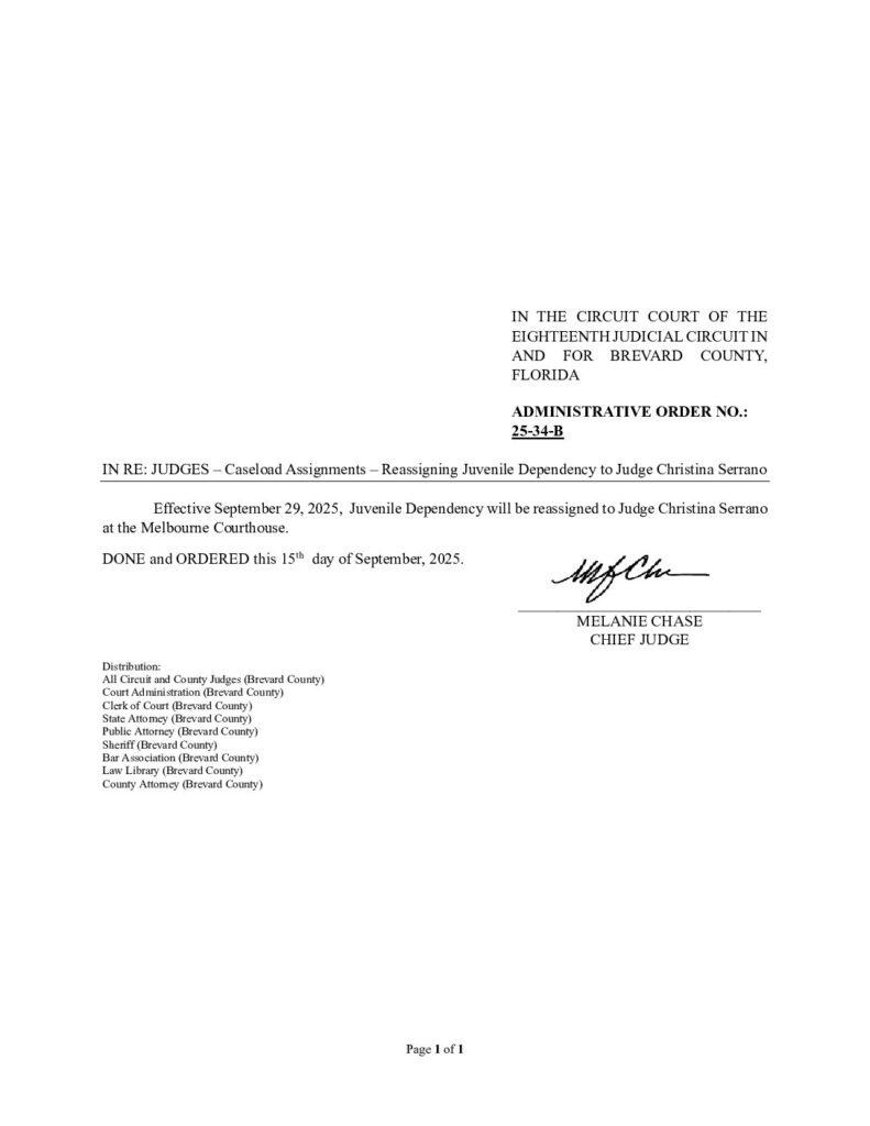 25-24-B AMENDED, SUPERSEDES 25-24-B IN RE: JUDGES – CASELOAD ASSIGNMENTS – ASSIGNMENT OF COUNTY CIVIL AND SMALL CLAIMS CASES IN THE COUNTY COURT FOR BREVARD COUNTY, FLORIDA – EFFECTIVE OCTOBER 1, 2025 – ORDERED 10/08/2025 BY MELANIE CHASE