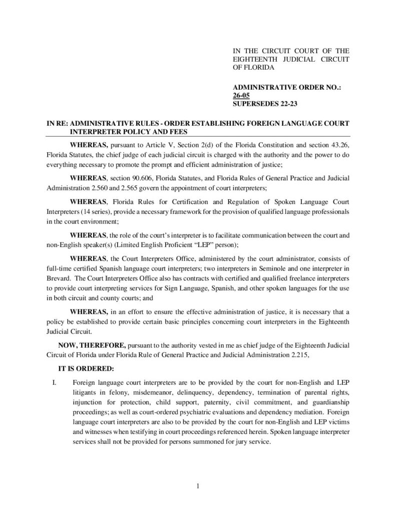 26-05, SUPERSEDES 22-23 IN RE: ADMINISTRATIVE RULES – ORDER ESTABLISHING FOREIGN LANGUAGE COURT INTERPRETER POLICY AND FEES – ORDERED 1/08/2022 BY MELANIE CHASE