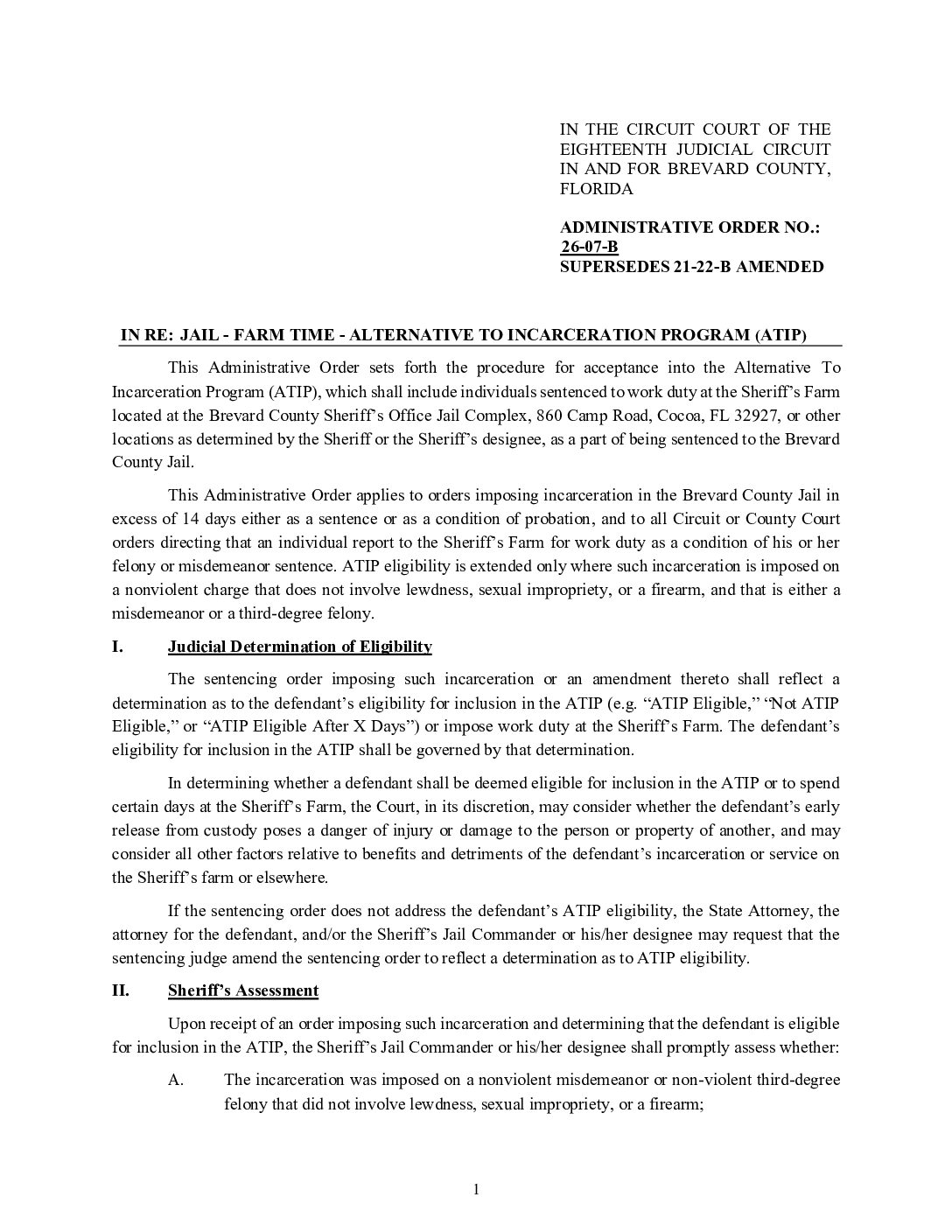 26-07-B, SUPERSEDES 21-22-B AMENDED IN RE: JAIL – FARM TIME – ALTERNATIVE TO INCARCERATION PROGRAM (ATIP) – ORDERED 1/21/2026 BY MELANIE CHASE