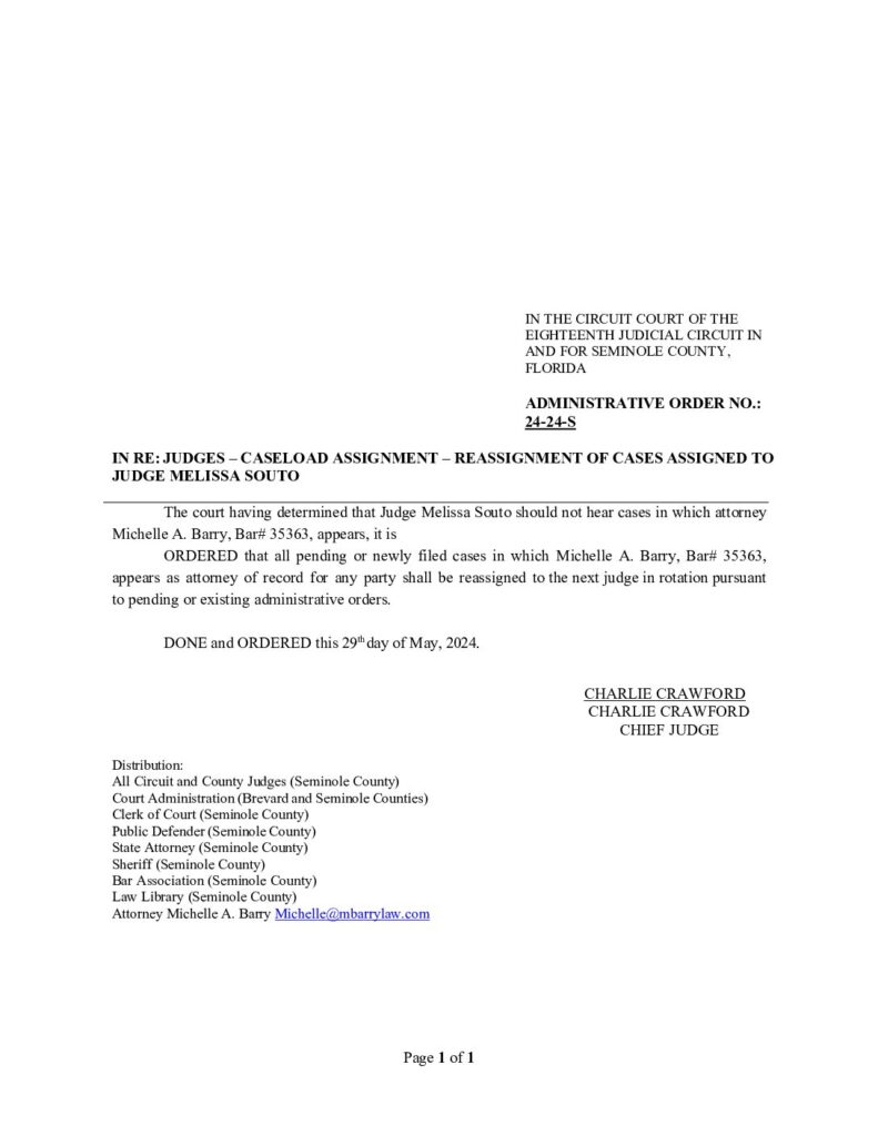 24-24-S IN RE: JUDGES – CASELOAD ASSIGNMENT – REASSIGNMENT OF CASES ASSIGNED TO JUDGE MELISSA SOUTO – ORDERED 05/29/2024 BY CHARLES G. CRAWFORD