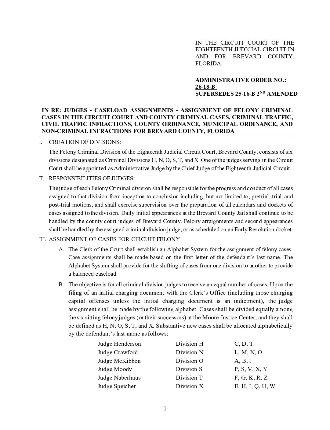 26-18-B, SUPERSEDES 25-16-B 2ND AMENDED IN RE: JUDGES – CASELOAD ASSIGNMENTS – ASSIGNMENT OF FELONY CRIMINAL CASES IN THE CIRCUIT COURT AND COUNTY CRIMINAL CASES, CRIMINAL TRAFFIC, CIVIL TRAFFIC INFRACTIONS, COUNTY ORDINANCE, MUNICIPAL ORDINANCE, AND NON-CRIMINAL INFRACTIONS FOR BREVARD COUNTY, FLORIDA ORDERED 3/27/2026 BY MELANIE CHASE