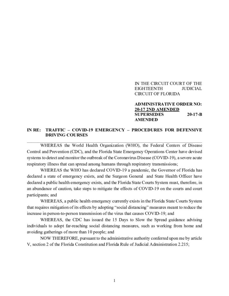 20-17 2ND AMENDED, SUPERSEDES 20-17-B AMENDED IN RE: TRAFFIC – COVID-19 EMERGENCY – PROCEDURES FOR DEFENSIVE DRIVING COURSES – ORDERED 4/08/2020 BY LISA DAVIDSON