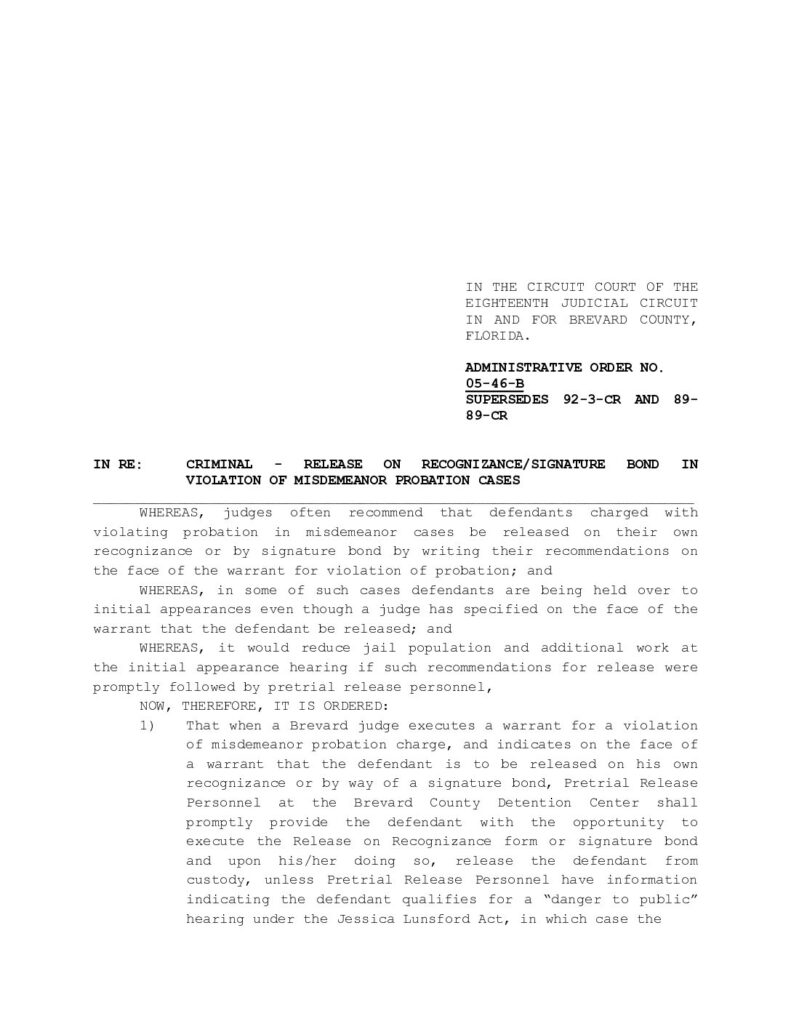 05-46-B, SUPERSEDES 92-3-CR AND 89-89-CR IN RE: CRIMINAL – RELEASE ON RECOGNIZANCE/SIGNATURE BOND IN VIOLATION OF MISDEMEANOR PROBATION CASES – ORDERED 9/21/2005 BY KERRY I. EVANDER