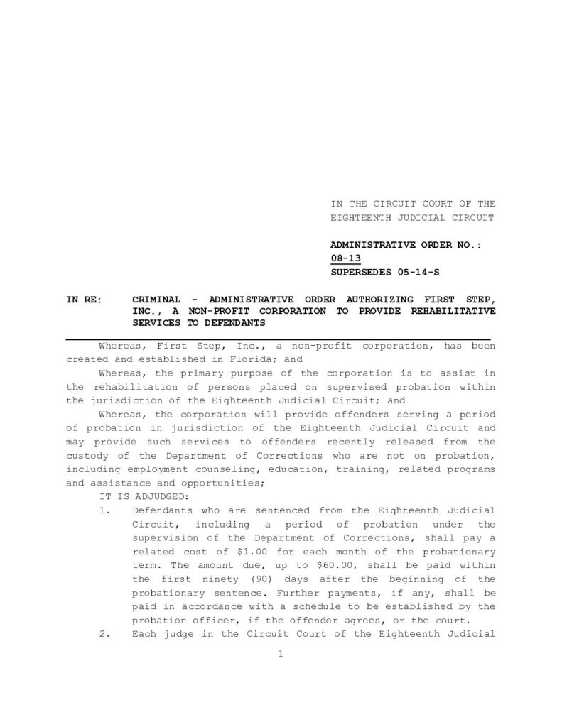 08-13, SUPERSEDES 05-14-S IN RE: CRIMINAL – ADMINISTRATIVE ORDER AUTHORIZING FIRST STEP, INC., A NON-PROFIT CORPORATION TO PROVIDE REHABILITATIVE SERVICES TO DEFENDANTS – ORDERED 6/12/2008 BY CLAYTON D. SIMMONS