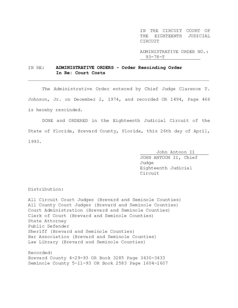 93-78 IN RE: ADMINISTRATIVE ORDERS – ORDER RESCINDING ORDER IN RE: COURT COSTS – ORDERED 4/26/1993 BY JOHN ANTOON II