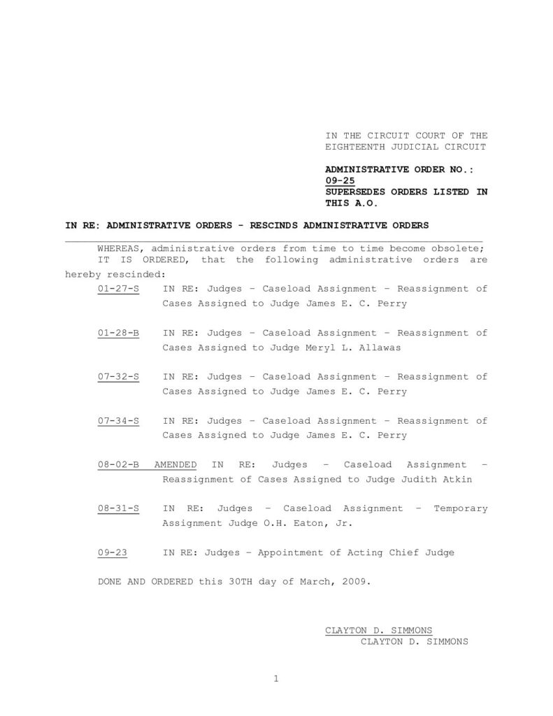 09-25, SUPERSEDES ORDERS LISTED IN THIS A.O. IN RE: ADMINISTRATIVE ORDERS – RESCINDS ADMINISTRATIVE ORDERS – ORDERED 3/30/2009 BY CLAYTON D. SIMMONS