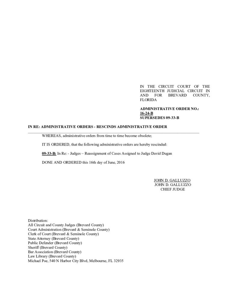 16-24-B, SUPERSEDES 09-33-B IN RE: ADMINISTRATIVE ORDERS – RESCINDS ADMINISTRATIVE ORDER – ORDERED 6/16/2016 BY JOHN D. GALLUZZO