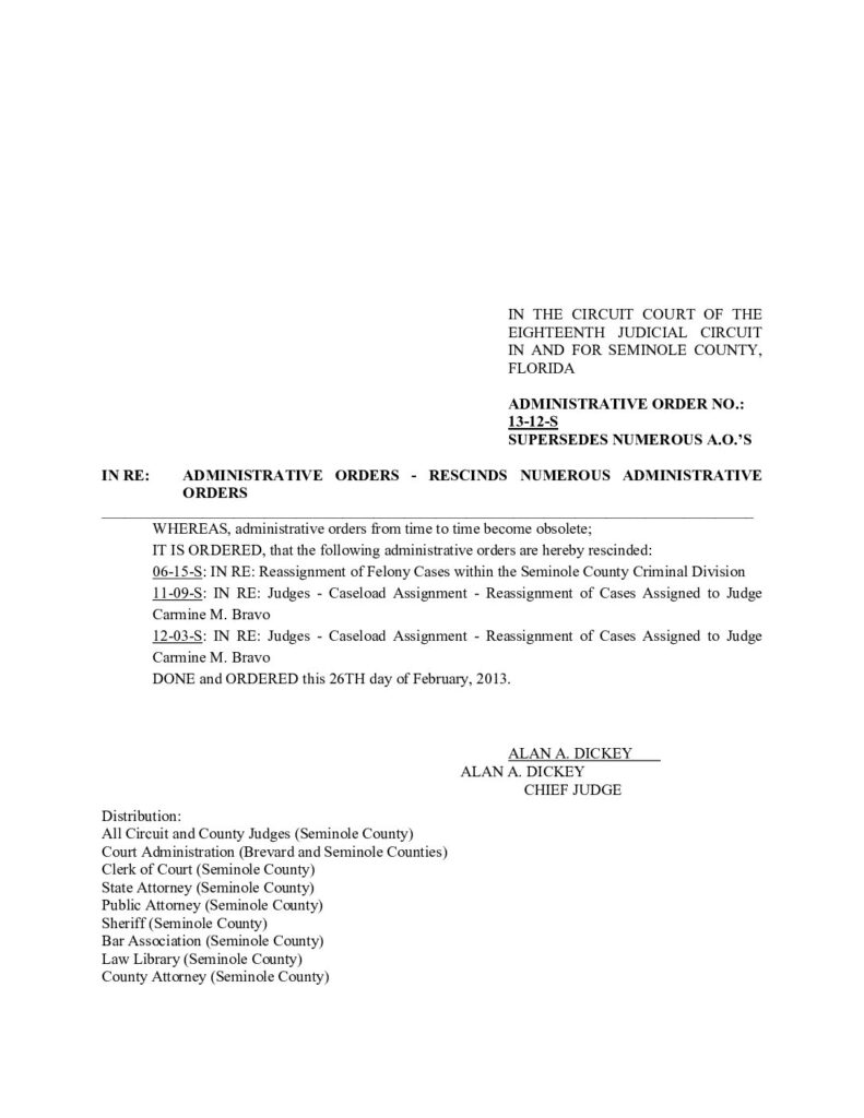 13-12-S IN RE: ADMINISTRATIVE ORDERS – RESCINDS NUMEROUS ADMINISTRATIVE ORDERS – ORDERED 2/26/2013 BY ALAN A. DICKEY
