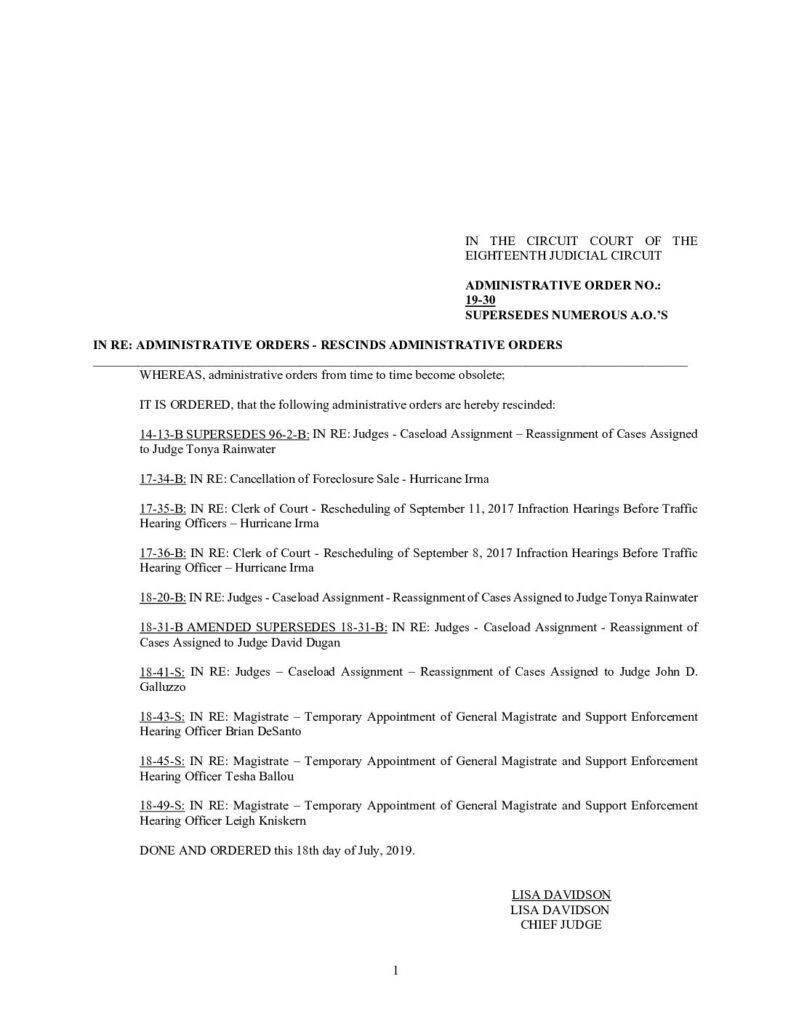 19-30, SUPERSEDES NUMEROUS A.O.’S IN RE: ADMINISTRATIVE ORDERS – RESCINDS ADMINISTRATIVE ORDERS – ORDERED 7/19/2019 BY LISA DAVIDSON