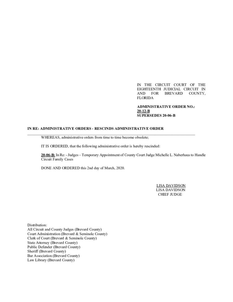 20-12-B, SUPERSEDES 20-06-B IN RE: ADMINISTRATIVE ORDERS – RESCINDS ADMINISTRATIVE ORDER – ORDERED 3/02/2020 BY LISA DAVIDSON