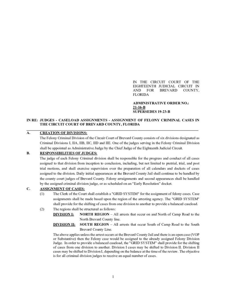 21-16-B, SUPERSEDES 19-23-B IN RE: CASELOAD ASSIGNMENTS – ASSIGNMENT OF FELONY CRIMINAL CASES IN THE CIRCUIT COURT OF BREVARD COUNTY, FLORIDA – ORDERED 1/15/2021 BY LISA DAVIDSON