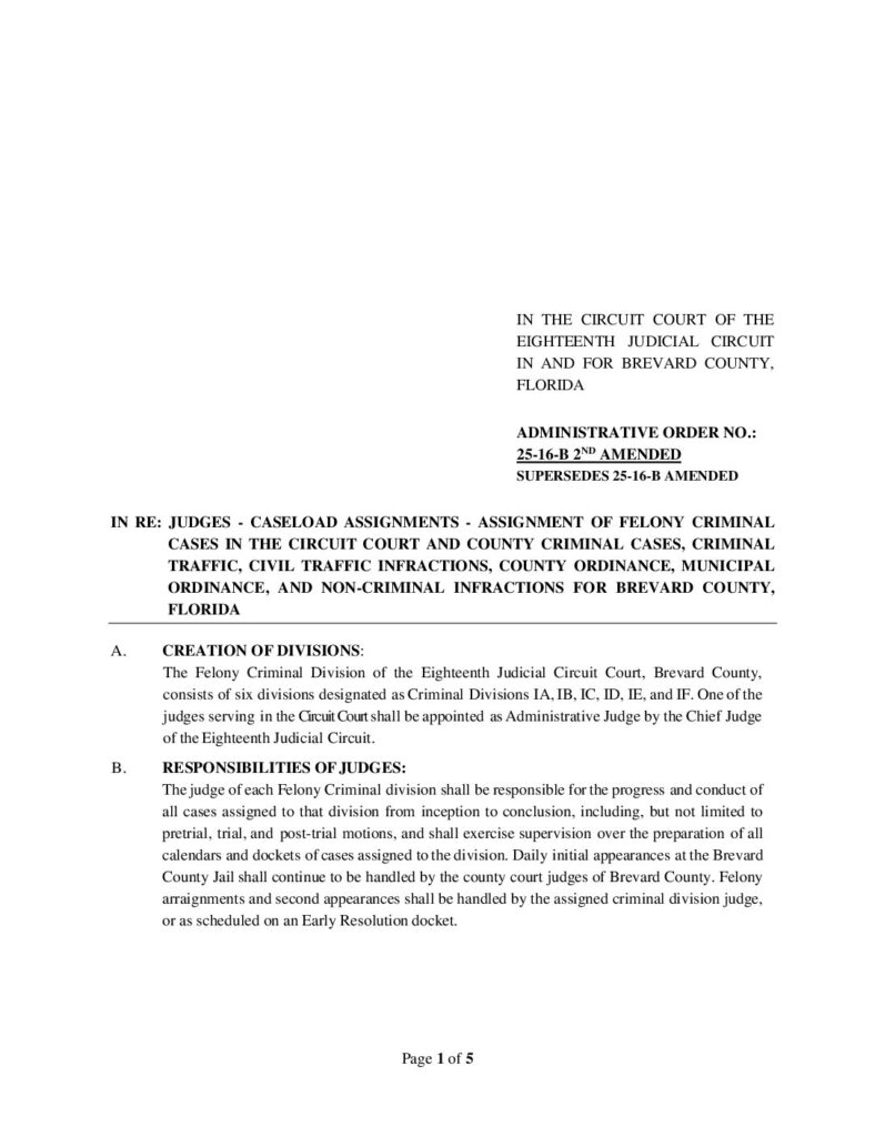 25-16-B 2ND AMENDED, SUPERSEDES 25-16-B AMENDED IN RE: JUDGES – CASELOAD ASSIGNMENTS – ASSIGNMENT OF FELONY CRIMINAL CASES IN THE CIRCUIT COURT AND COUNTY CRIMINAL CASES, CRIMINAL TRAFFIC, CIVIL TRAFFIC INFRACTIONS, COUNTY ORDINANCE, MUNICIPAL ORDINANCE, AND NON-CRIMINAL INFRACTIONS FOR BREVARD COUNTY, FLORIDA ORDERED 09/29/2025 BY MELANIE CHASE