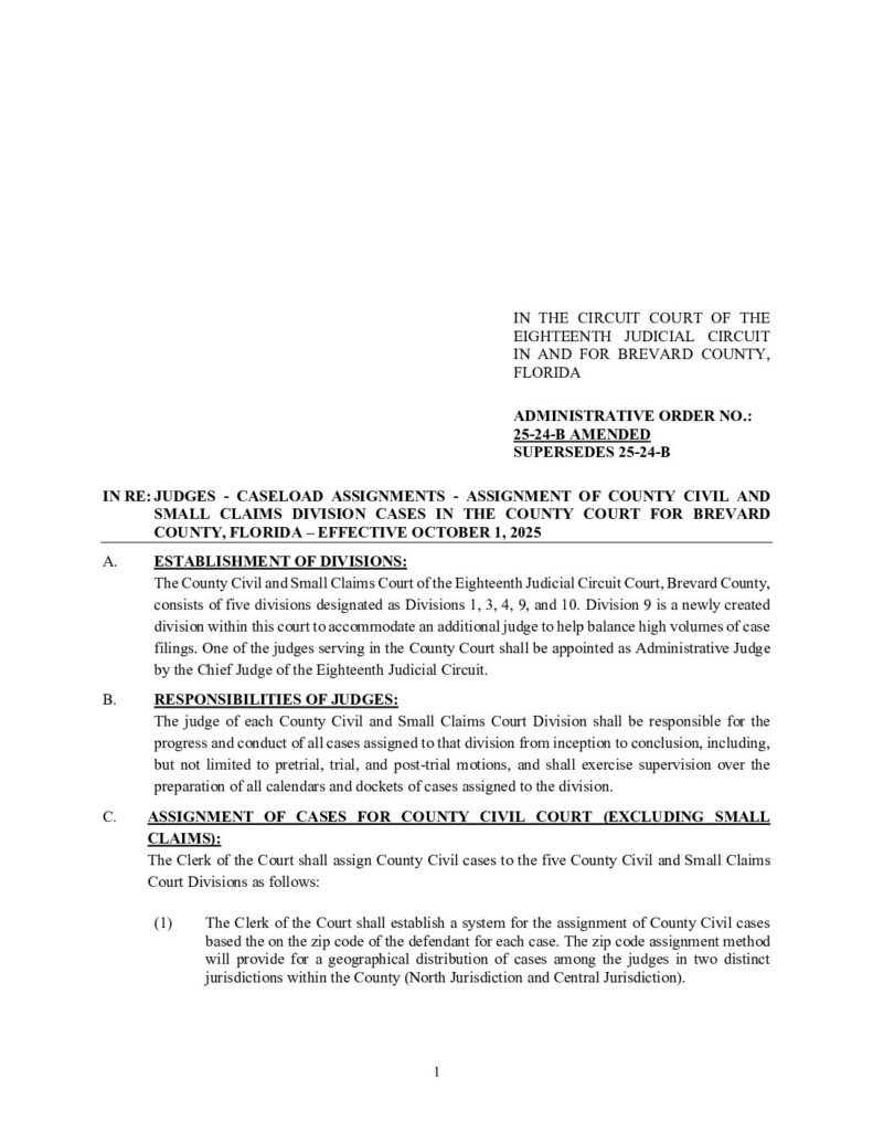 25-24-B AMENDED, SUPERSEDES 25-24-B IN RE: JUDGES – CASELOAD ASSIGNMENTS – ASSIGNMENT OF COUNTY CIVIL AND SMALL CLAIMS CASES IN THE COUNTY COURT FOR BREVARD COUNTY, FLORIDA – EFFECTIVE OCTOBER 1, 2025 – ORDERED 10/08/2025 BY MELANIE CHASE