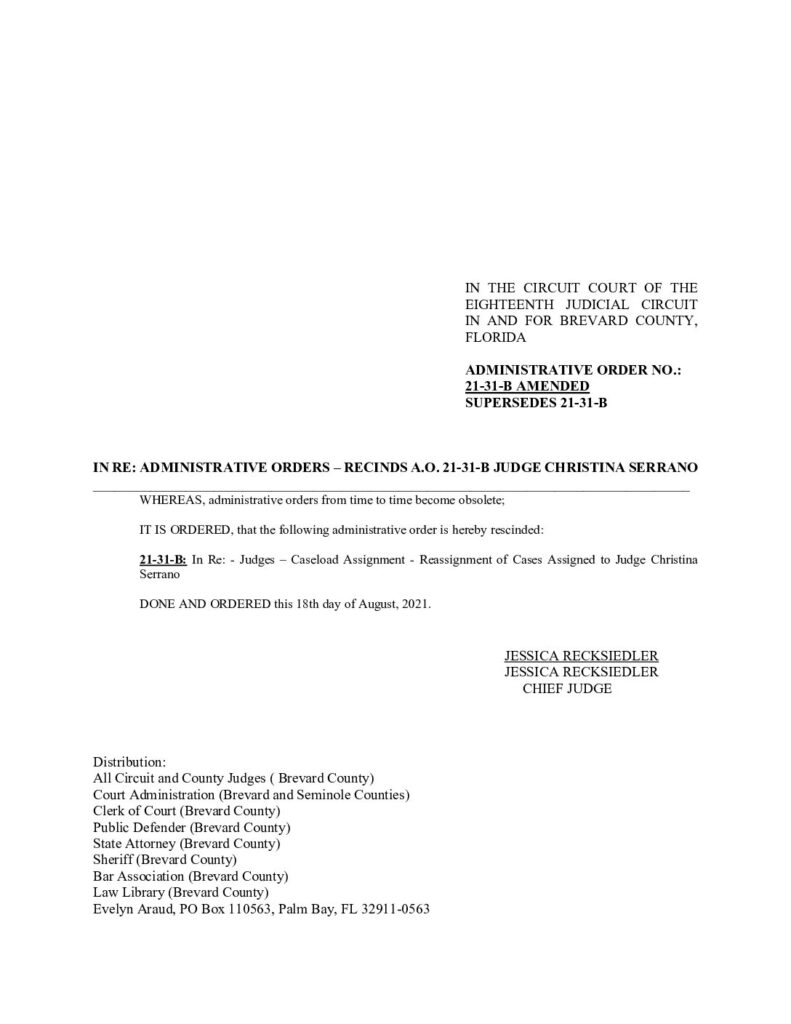 21-31-B AMENDED, SUPERSEDES 21-31-B IN RE: ADMINISTRATIVE ORDERS – RECINDS A.O. 21-31-B JUDGE CHRISTINA SERRANO – ORDERED 8/18/2021 BY JESSICA RECKSIEDLER