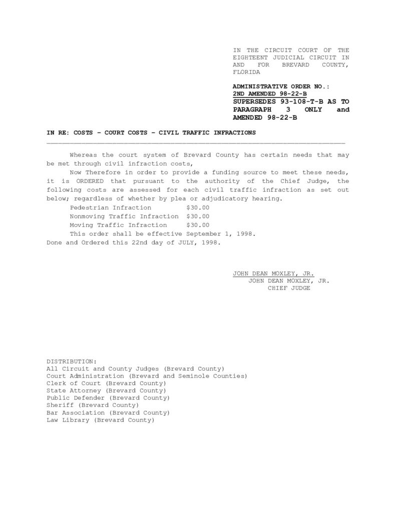 98-22-B 2ND AMENDED IN RE: COURT COSTS – CIVIL TRAFFIC INFRACTIONS, SUPERSEDES 93-108-T-B AS TO PARAGRAPH 3 ONLY AND AMENDED 98-22-B – ORDERED 7/22/1998 BY JOHN DEAN MOXLEY, JR.