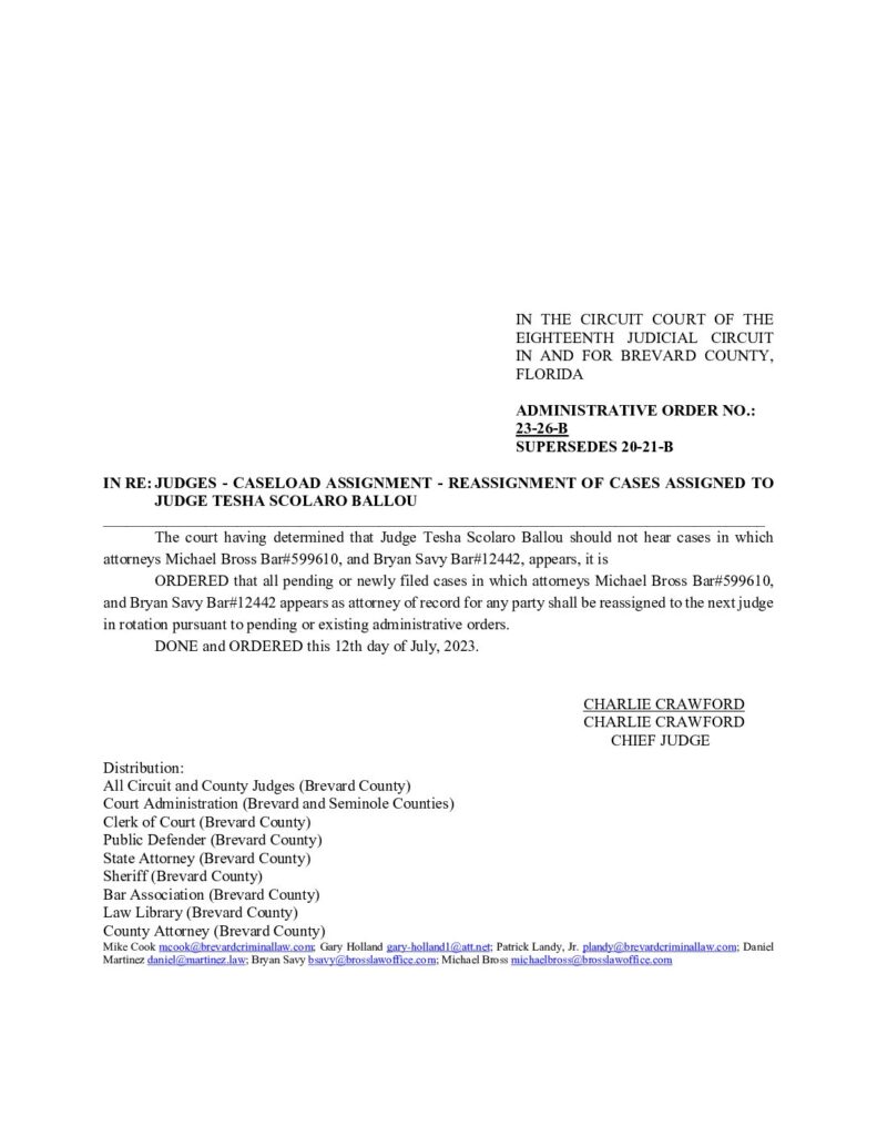 23-26-B, SUPERCEDES 20-21-B IN RE: JUDGES – CASELOAD ASSIGNMENT – REASSIGNMENT OF CASES ASSIGNED TO JUDGE TESHA SCOLARO BALLOU – ORDERED 7/12/2023 BY CHARLIE CRAWFORD