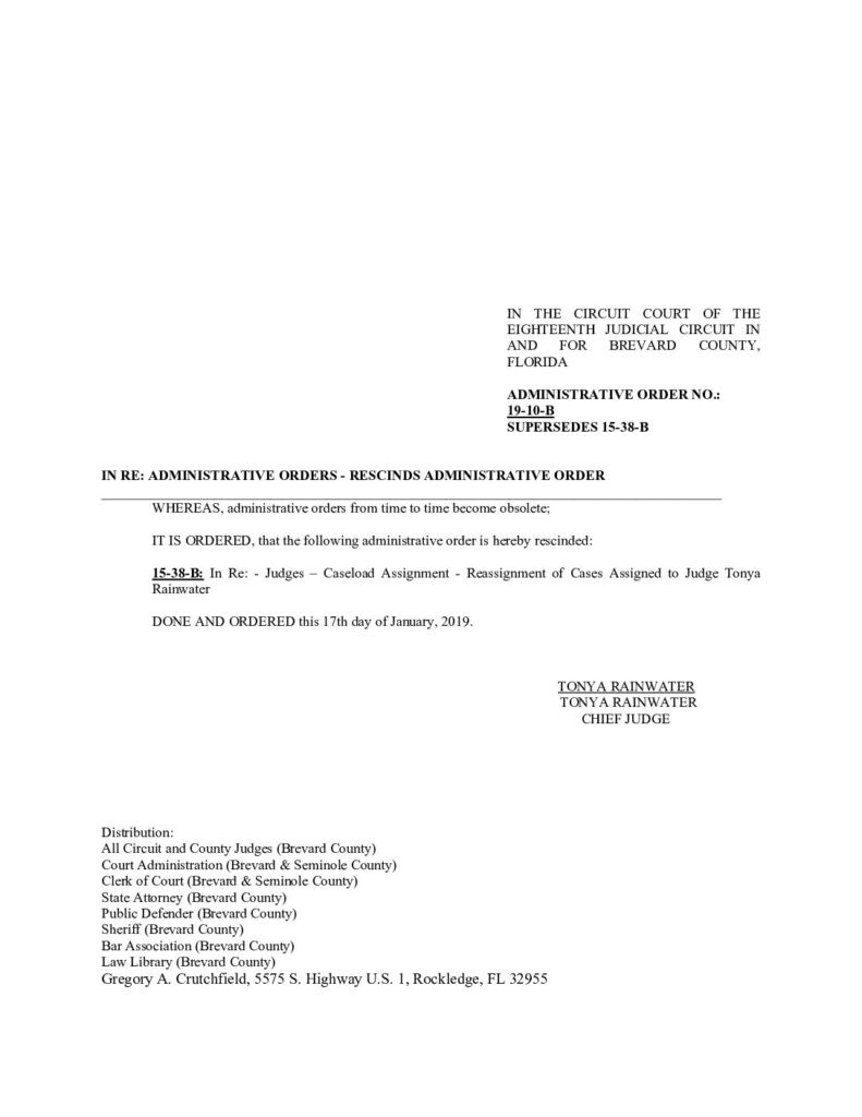 19-10-B, SUPERSEDES 15-38-B IN RE: ADMINISTRATIVE ORDERS – RESCINDS ADMINISTRATIVE ORDER – ORDERED 1/17/2019 BY TONYA RAINWATER