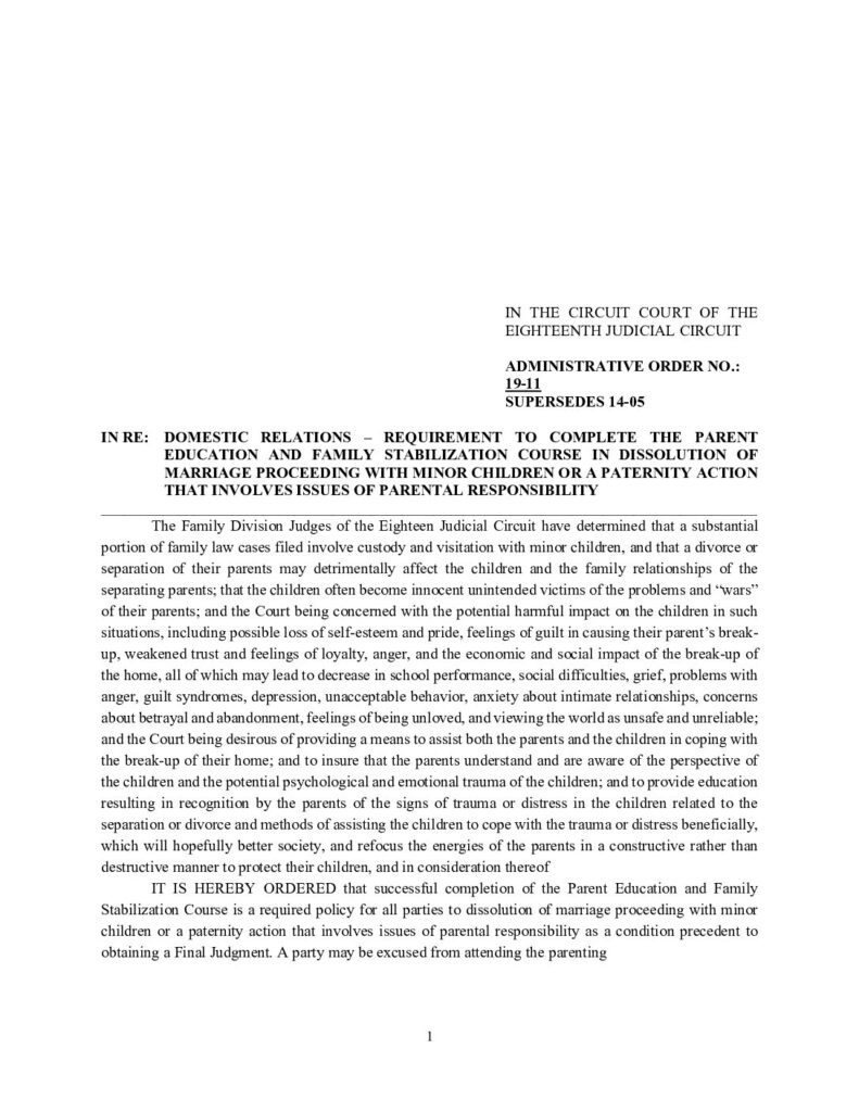 19-11, SUPERSEDES 14-05 IN RE: DOMESTIC RELATIONS – REQUIREMENT TO COMPLETE THE PARENT EDUCATION AND FAMILY STABILIZATION COURSE IN DISSOLUTION OF MARRIAGE PROCEEDING WITH MINOR CHILDREN OR A PATERNITY ACTION THAT INVOLVES ISSUES OF PARENTAL RESPONSIBILITY – ORDERED 1/24/2019 BY TONYA RAINWATER