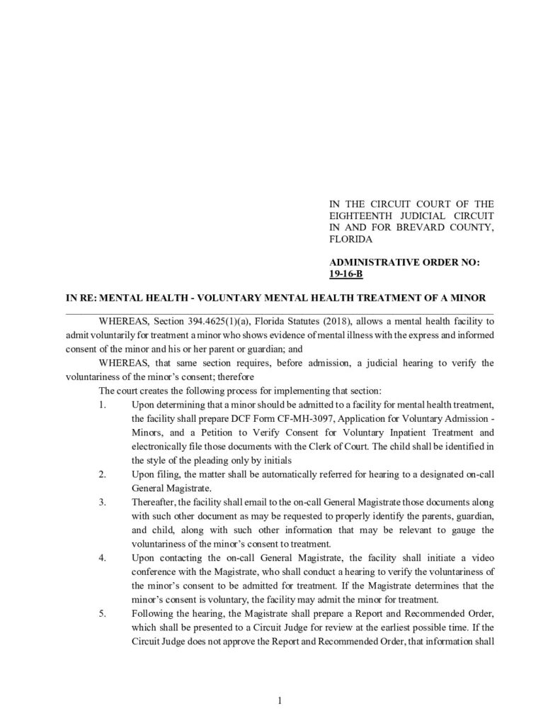 19-16-B IN RE: MENTAL HEALTH – VOLUNTARY MENTAL HEALTH TREATMENT OF A MINOR – ORDERED 1/26/2019 BY TONYA RAINWATER