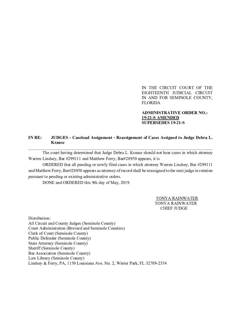 19-21-S AMENDED, SUPERSEDES 19-21-S IN RE: CASELOAD ASSIGNMENT/RE-ASSIGNMENT OF CASES ASSIGNED TO JUDGE DEBRA L. KRAUSE – ORDERED 5/09/2019 BY TONYA RAINWATER