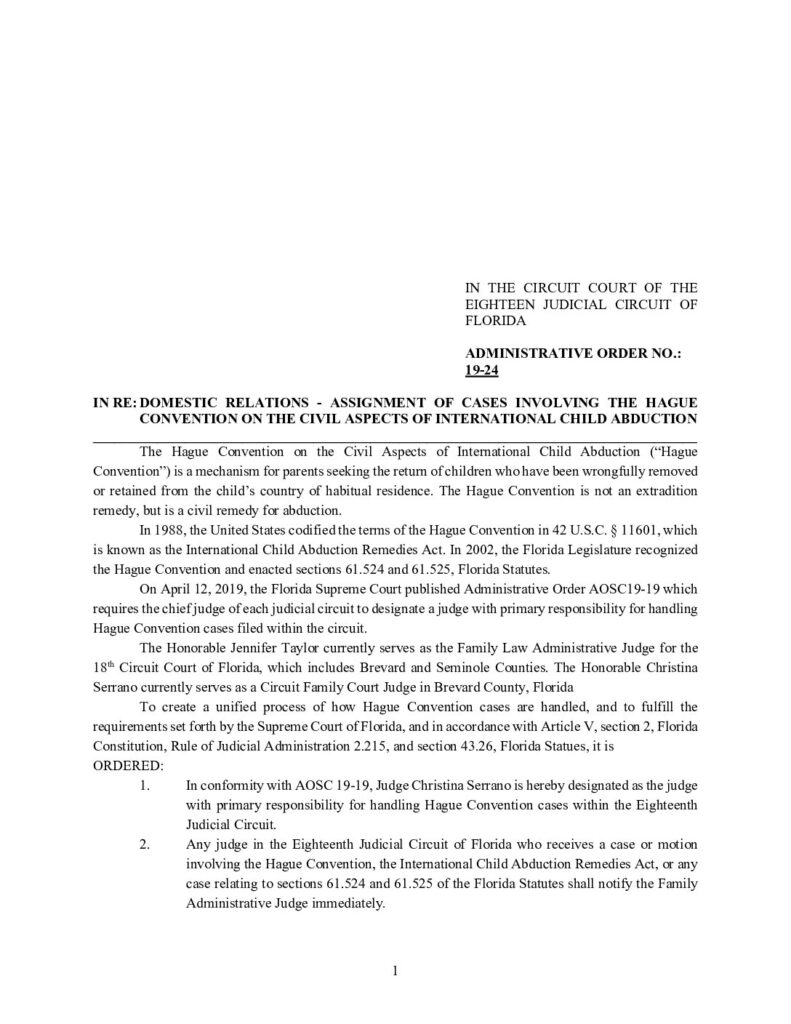 19-24 IN RE: DOMESTIC RELATIONS – ASSIGNMENT OF CASES INVOLVING THE HAGUE CONVENTION ON THE CIVIL ASPECTS OF INTERNATIONAL CHILD ABDUCTION – ORDERED 5/23/2019, TONYA RAINWATER