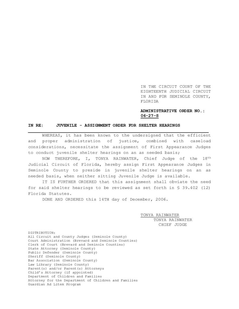06-27-S IN RE: JUVENILE – ASSIGNMENT ORDER FOR SHELTER HEARINGS – ORDERED 12/14/2006 BY TONYA RAINWATER