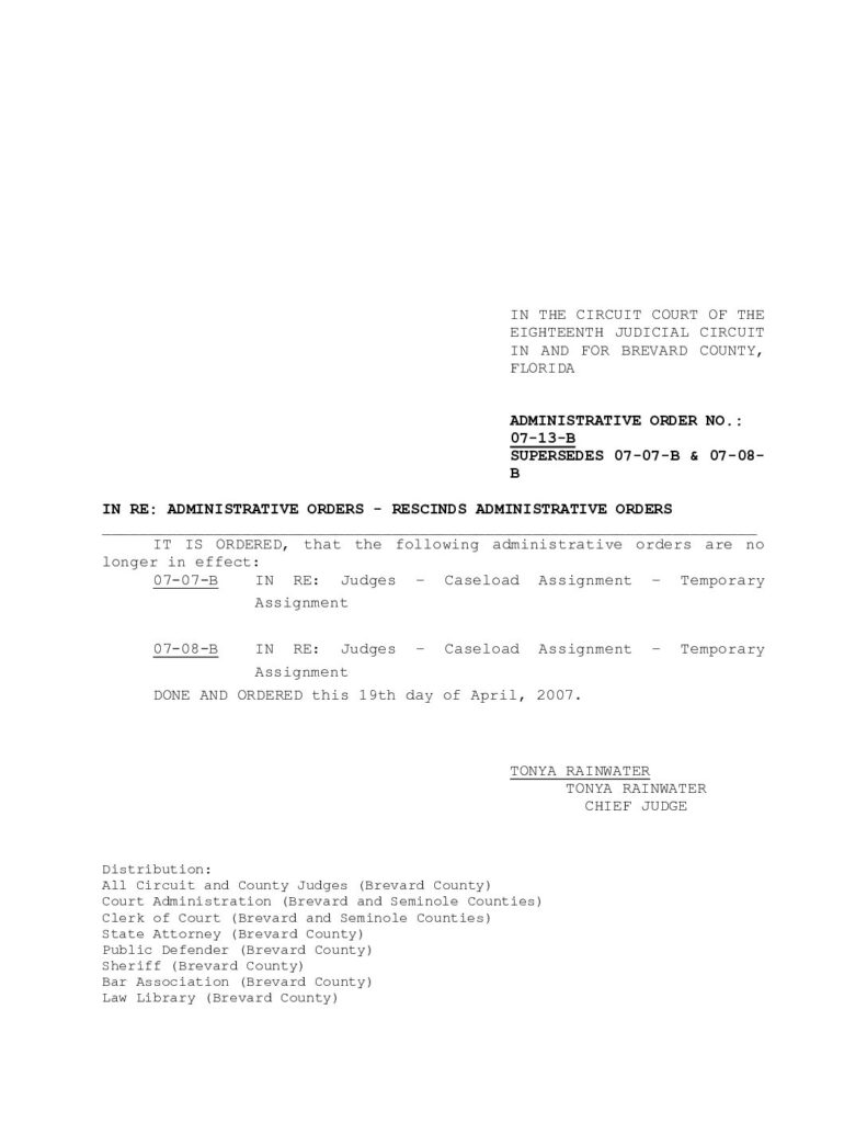 07-13-B, SUPERSEDES 07-07-B AND 07-08-B IN RE: ADMINISTRATIVE ORDERS – RESCINDS ADMINISTRATIVE ORDERS – ORDERED 4/19/07 BY TONYA RAINWATER